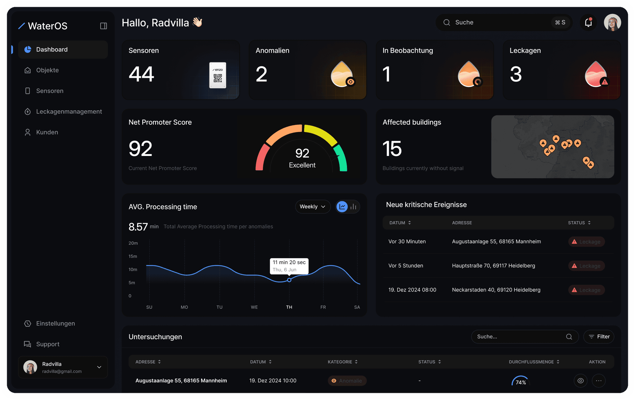 Our intuitive app and desktop cockpit turn complex water data into actionable insights - enabling users to monitor consumption, manage incidents, and optimize entire property portfolios in real time.
