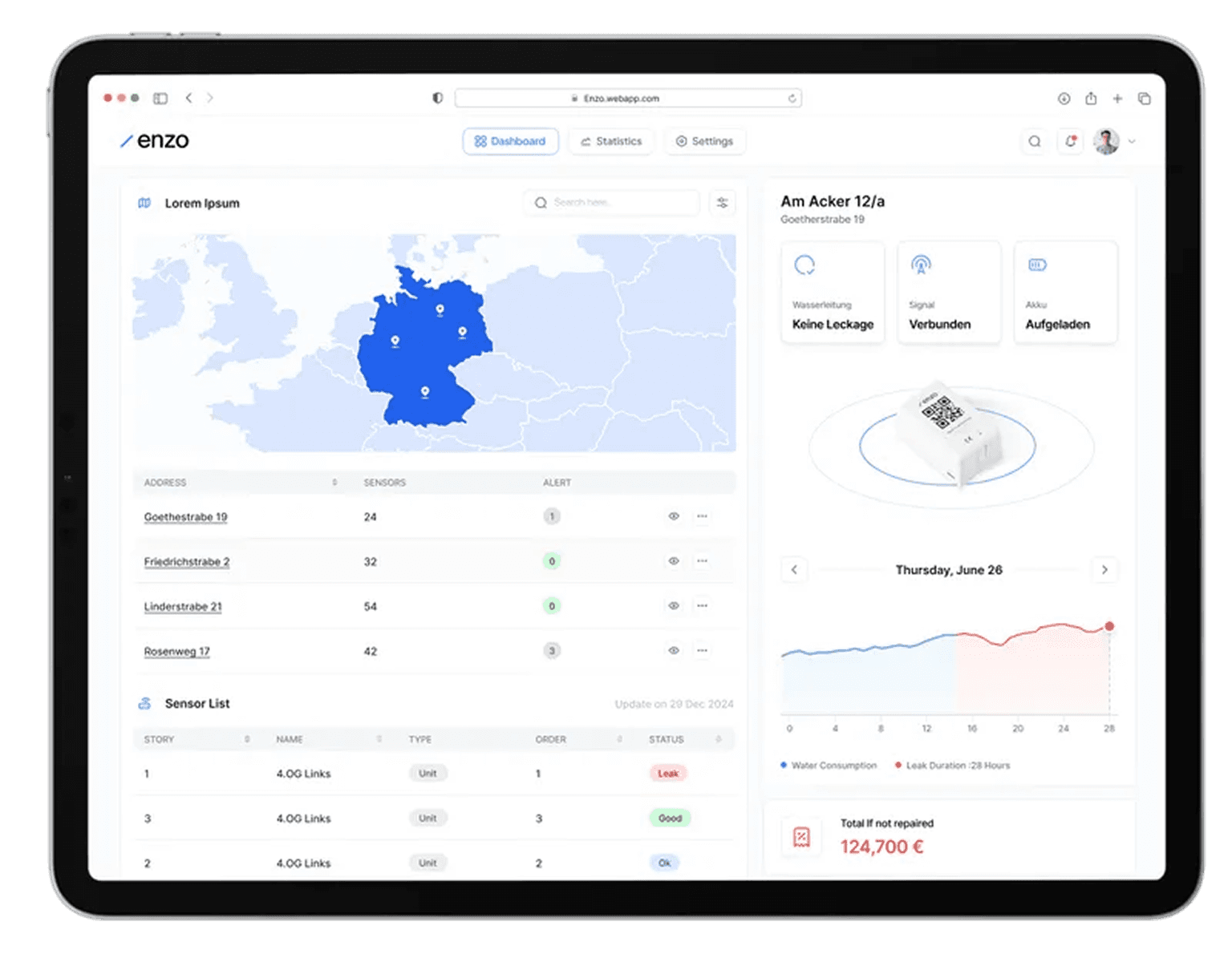 With Enzo one.drop, you can monitor individual buildings or entire portfolios, effectively protect them from water damage, and achieve your ESG goals.